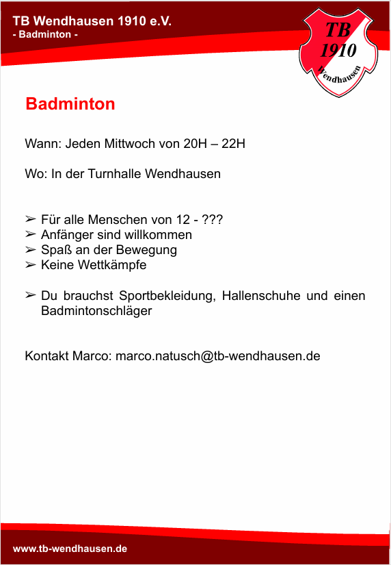 Badminton, das schnelle Federballspiel, benannt nach dem gleichnamigen Landsitz des Duke of Beaufort, wo das eigentlich aus Indien stammende Spiel erstmals ausgeübt wurde, wird seit ca. 30 Jahren in der TBW angeboten.